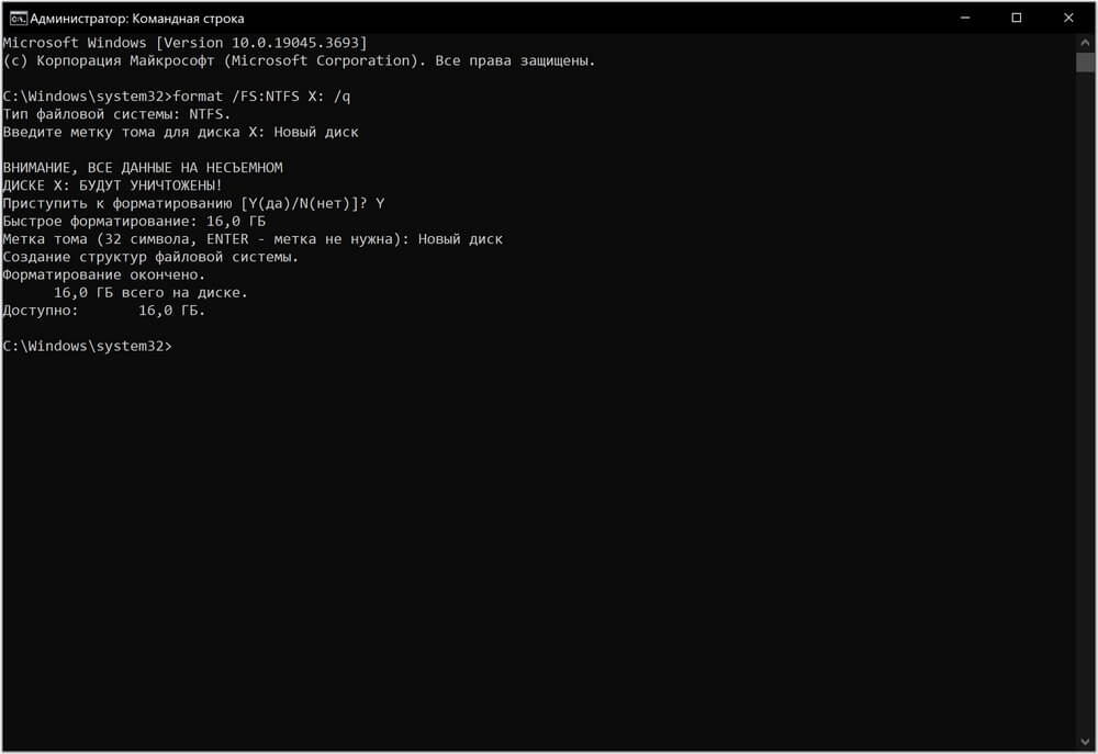 В данную команду добавлены ключи: /x — отключение тома, /q — быстрое форматирование. Первый ключ отключает внешнее воздействие на диск от работающей операционной системы, чтобы все прошло удачно. Второй ключ запускает быстрое форматирование. При быстром форматировании Windows помечает все пространство диска как неиспользованное. Данные остаются на диске, операционная система их не видит, на это место постепенно записываются новые файлы. При обычном, полном форматировании все данные на диске удаляются, но этот процесс занимает гораздо больше времени, чем быстрое форматирование.