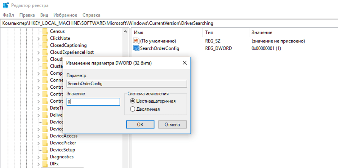 после откройте параметр SearchOrderConfig и присвойте ему значение “0” (без кавычек). По умолчанию у него значение “1”, которое разрешает поиск драйвера;