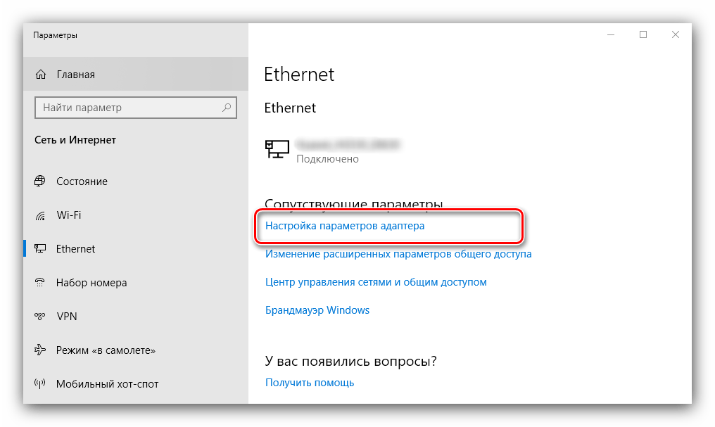Откроется пункт «Ethernet» категории параметров «Сеть и Интернет». Здесь нажмите на ссылку «Настройка параметров адаптера».