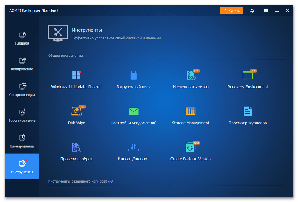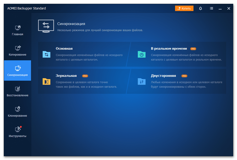 Программа поддерживает несколько типов синхронизации данных – базовую зеркальную, двустороннюю и в режиме реального времени, а также средство создания загрузочного диска, портативной версии, среды восстановления и многое другое. AOMEI Backupper получила сразу пять версий, при этом в бесплатной можно выполнять клонирование только с MBR на MBR-диск. Кроме того, без лицензии хотя бы на профессиональное издание вы не сможете переносить операционную систему, клонировать динамические диски, а также пользоваться многими другими функциями.