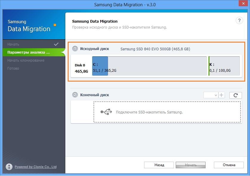 Сразу после запуска утилиты подключите к компьютеру SSD с помощью соответствующего переходника. Кликните на клавишу «Начать».