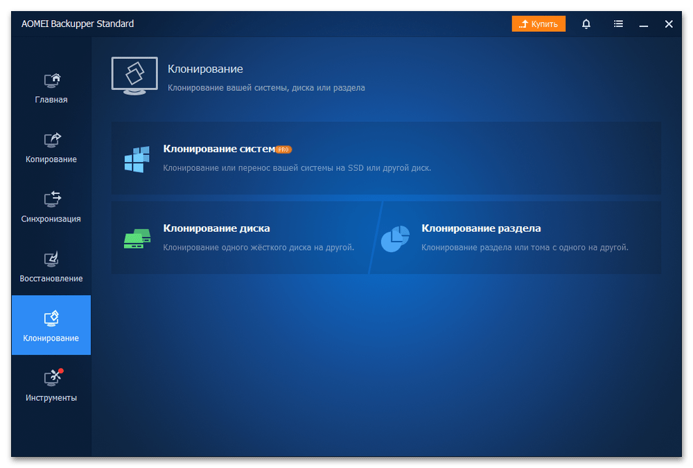 AOMEI Backupper – программное обеспечение для защиты Windows и Windows Server, а также всего содержимого накопителя компьютера с помощью инструментов резервирования, клонирования и восстановления данных. Что касается интересующего нас вопроса, то программа поддерживает полное копирование жесткого диска на SSD вместе с OS, разделами, их буквами, индивидуальными настройками, личными файлами и т.д.