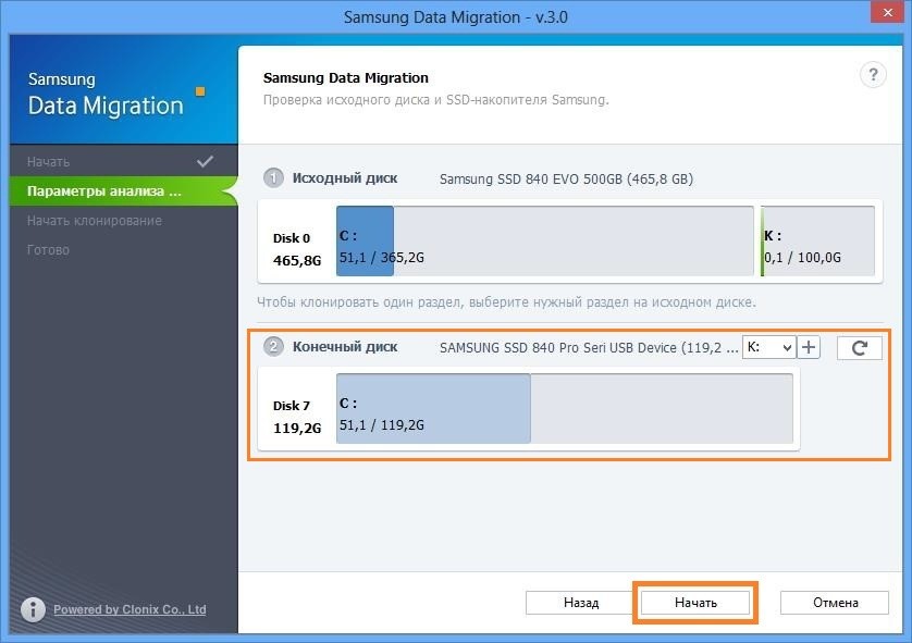 Если место, которое занимает Windows на HDD не превышает доступное место на SSD, вы можете сразу приступать к переносу, нажав на клавишу «Начать».