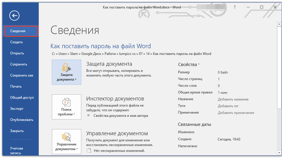 Путь: «Файл» «Сведения» — и только нюанс в «Защитить паролем» — нужно будет избрать «Зашифровать с использованием пароля»…