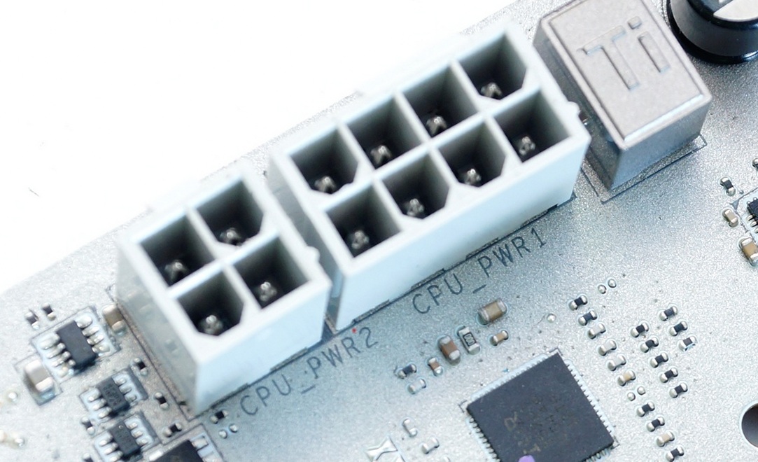 Для питания процессора используется 4-контактный разъем CPU. Их бывает два или еще сдвоеный, то есть 8-контактный, для мощных процессоров.
