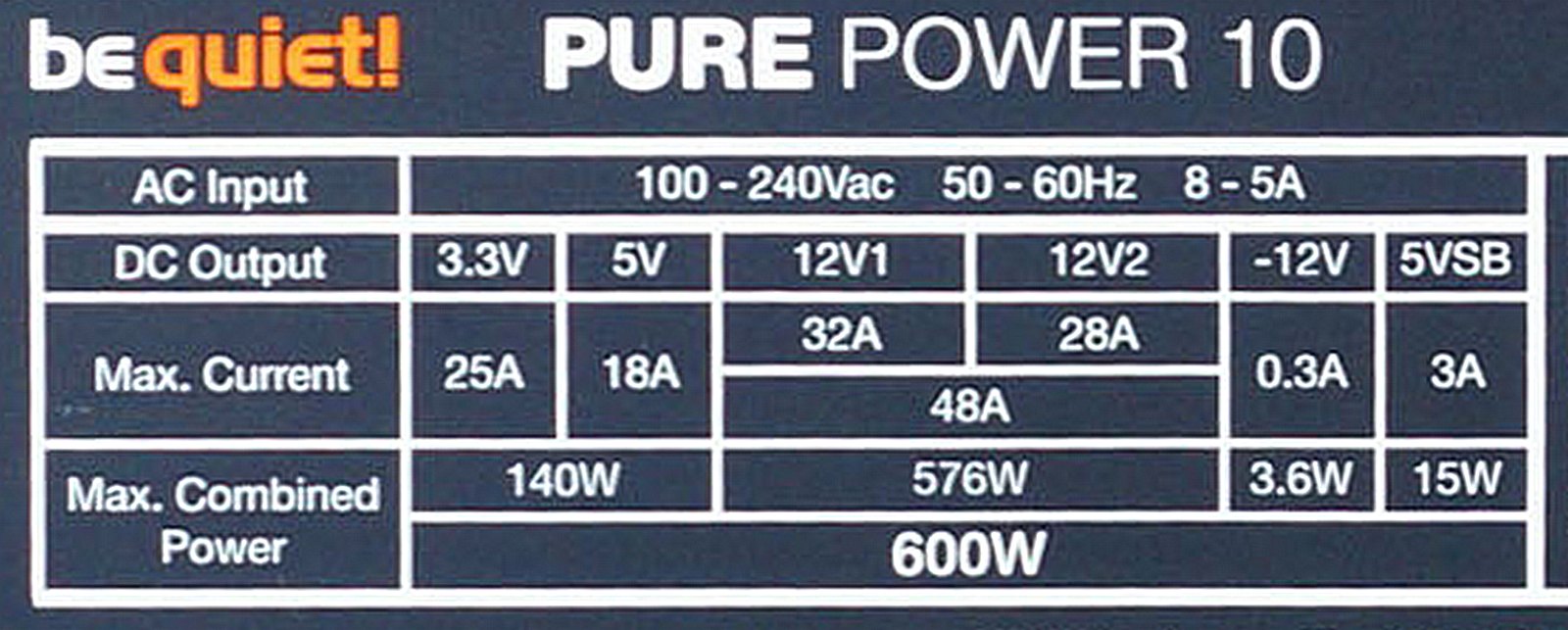 12-вольтовые линии, это те, по которым как раз и передается «львиная» доля мощности. Чем больше этих линий, тем лучше. Обычно это количество не выходит за рамки диапазона 1–6 линий. Но наибольший интерес представляет параметр «суммарный ток по линиям 12V», соответственно чем он больше, тем больше будет мощность, идущая от БП к основным потребителям: процессор, видеокарты, жесткие диски. Всю необходимую информацию можно поглядеть на этикетке, опять же.