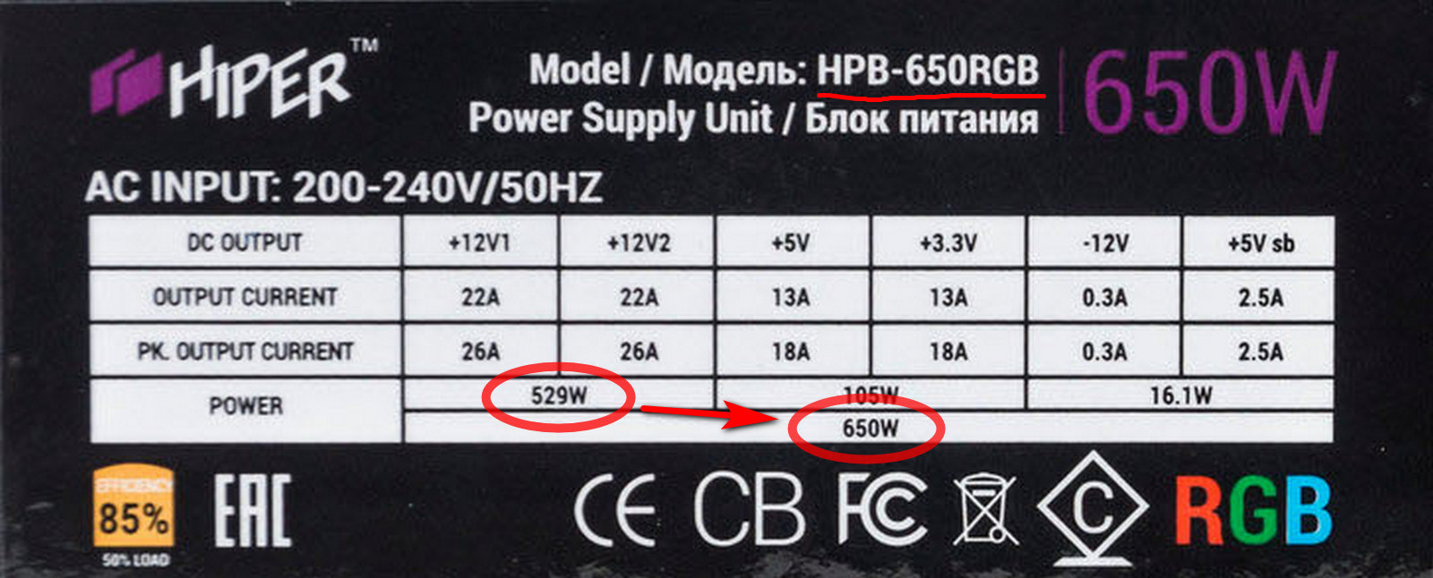 В бюджетных моделях зачастую производители указывают общую мощность в виде суммы максимально выдаваемых Ватт по всем линиям. Например, по линии +12 В — 530 Вт, по линиям +3,3 и +5 В – 120 Вт, а модель маркируется как 650 Вт, хотя по факту это — модель на 550 Вт.