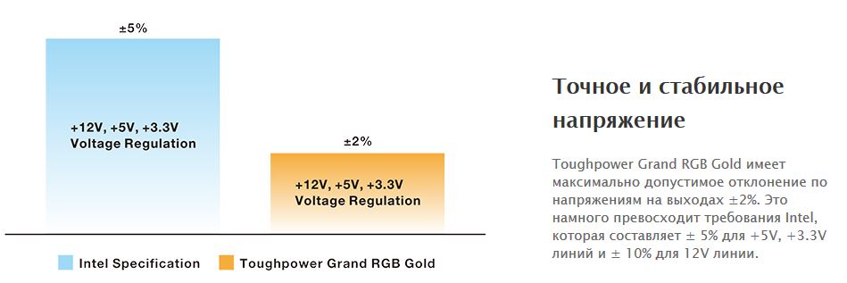 По требованиям стандарта ATX12V отклонение напряжений должно укладываться в 5%. Например, для линии +12 В стабильным считается напряжение при различных нагрузках в пределах от +11.4 до +12.6 В. У качественно выполненной схемотехники отклонения укладываются в 1-2%, и это значение иногда указывается на сайте производителя.