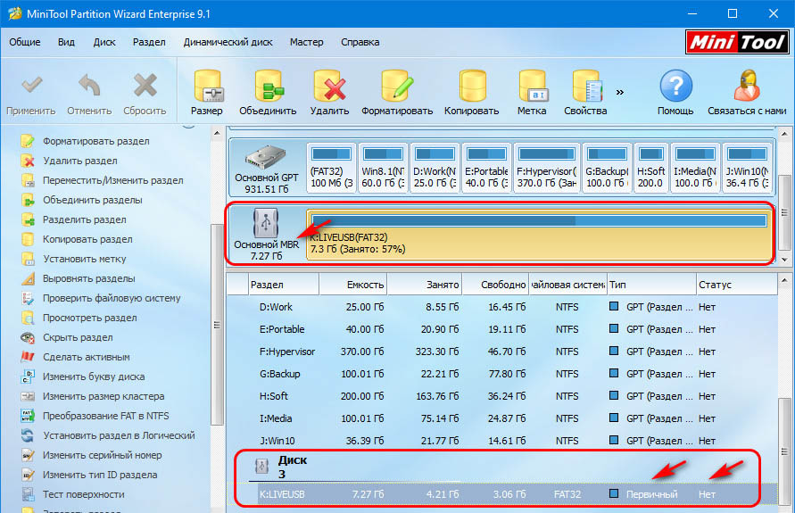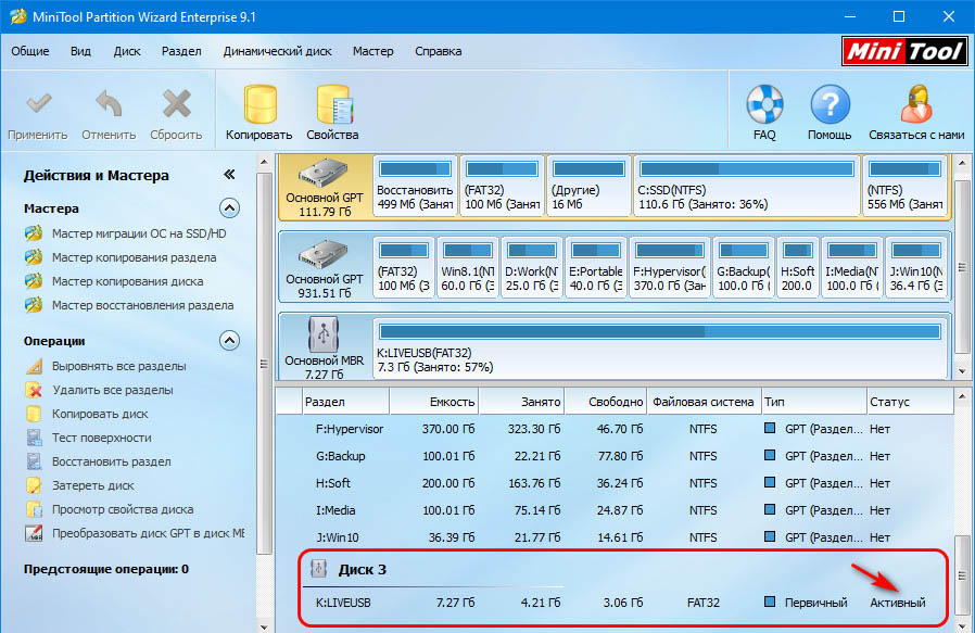 Но чтобы она подходила ещё и для режима Legacy, нужно адаптировать её. Для этого нам понадобится любая функциональная программа для разметки дискового пространства. В нашем случае мы будем использовать одну из старых версий MiniTool Partition Wizard. В окне программы смотрим карту нашей флешки и её табличное представление. Стиль разметки флешки у нас верный – MBR. Раздел флешки — первичный (основной), всё верно. А вот статуса активного этот раздел не имеет.