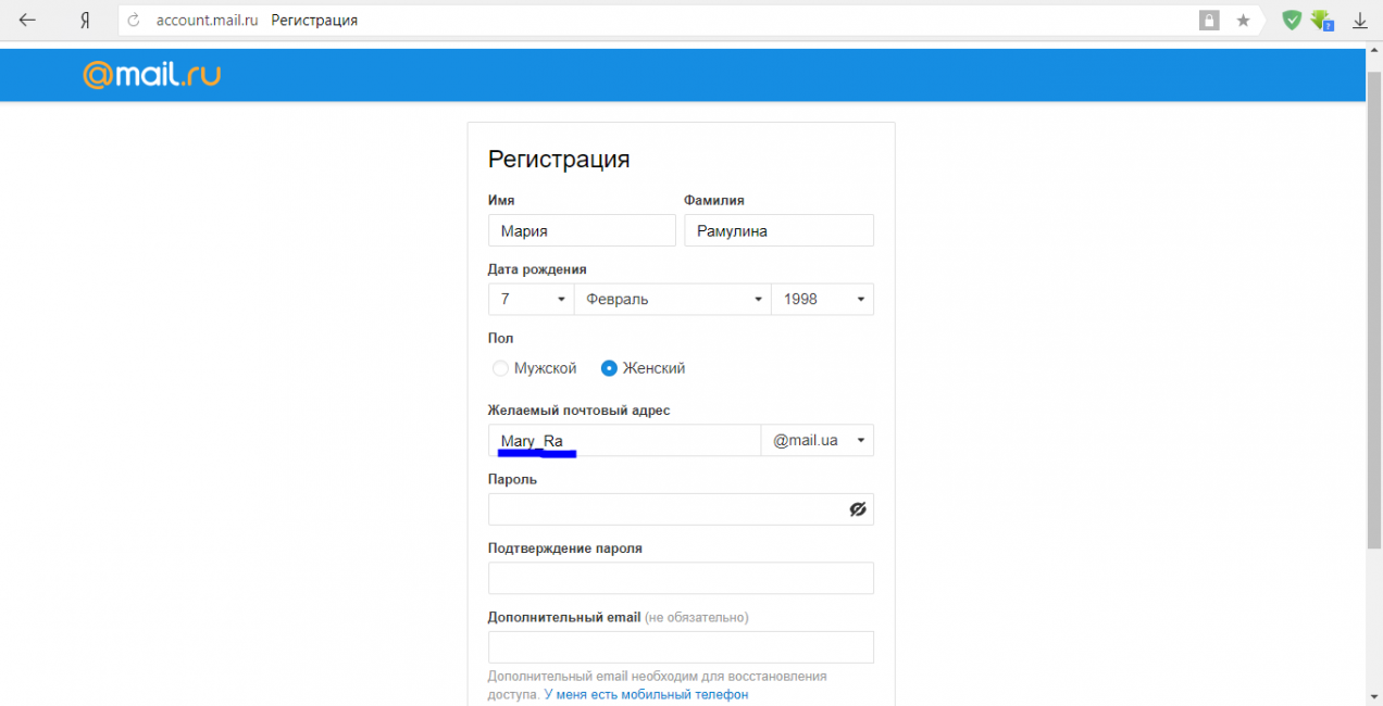 Есть два типа имени пользователя на Mail.ru: реальные имя с фамилией, а также псевдоним, который будет составляющей частью электронного адреса. Зарегистрировать емайл почту бесплатно на имя любимого персонажа, название компьютерной игры, другие слова и цифры вполне допустимо.