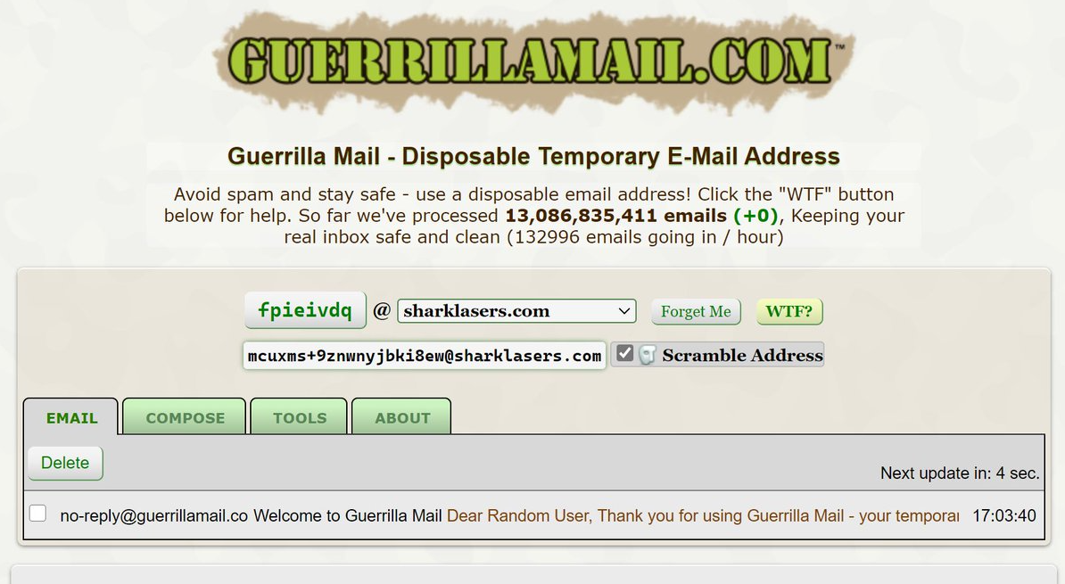 Guerilla Mail — сервис, предлагающий временную электронную почту. Письма здесь можно не только получать, но и отвечать на них. Для использования не нужно регистрироваться, как и в других подобных сервисах, адрес генерируется сам. Полностью письма удаляются спустя 1 час. Помимо этого, есть возможность получать, просматривать и загружать вложения из сообщений.
