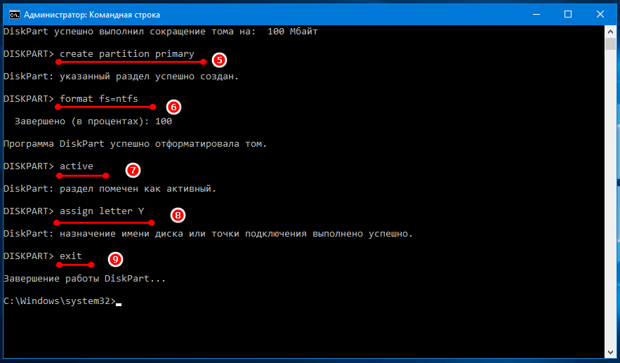 Пятой командой создаём новый раздел, шестой форматируем его в NTFS
