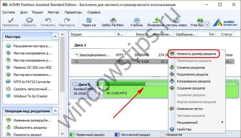 Чтобы уменьшить раздел С, кликаем его в окне AOMEI Partition Assistant. В контекстном меню выбираем изменение размера раздела.