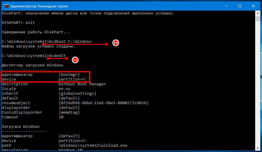 Теперь, чтобы система смогла загружаться с нового раздела, необходимо создать на нём загрузочные файлы. Для этого выполняем следующую команду: