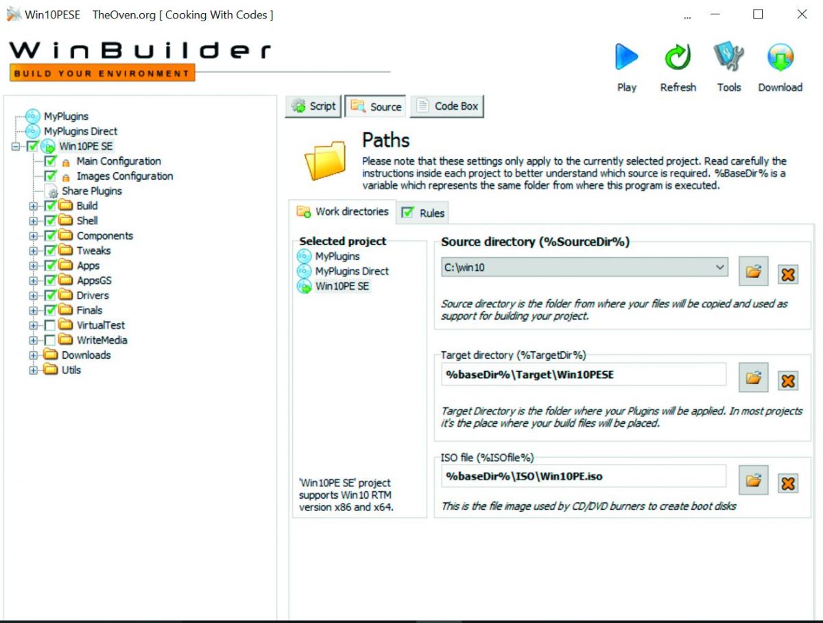 Основным параметром Win10 PE SE в главном модуле WinBuilder является путь к распакованному файлу Windows ISO