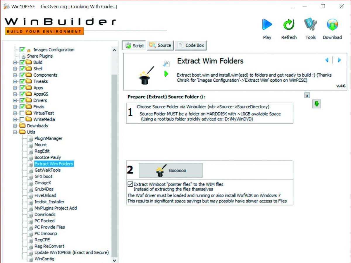 Следующий важный шаг начинается с меню в левой части экрана. В самом низу вы найдете пункт «Utils». Щелкните по этой директории и выберите запись «Extract WIM Folders». Теперь нажмите на кнопку «Script». Справа вы увидите небольшую зеленую стрелку, указывающую вниз. Нажмите на нее, чтобы скачать плагин.