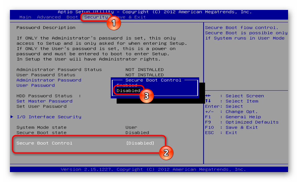 Не получается выйти из режима потому, что в БИОС включена функция Secure Boot. Если описанные выше команды не сработали, то зайдите в БИОС, найдите там параметр «Secure Boot» (находится может на разных вкладках – это зависит от BIOS, поэтому просмотрите все) и напротив него поставьте «Disabled». Затем отключите режим через командную строку (используйте первую команду), вернитесь в БИОС и поставьте рядом с «Secure Boot» «Enabled» – это мы вновь включили функцию.