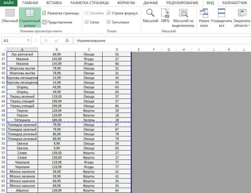Примечание: Чтобы скрыть синие пунктирные линии, в меню Excel выберите пункт Параметры ,щелкните Вид ,а затем скройте параметр Показывать разрывы страниц.