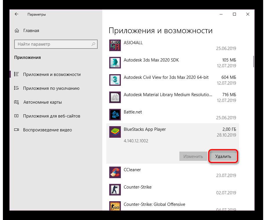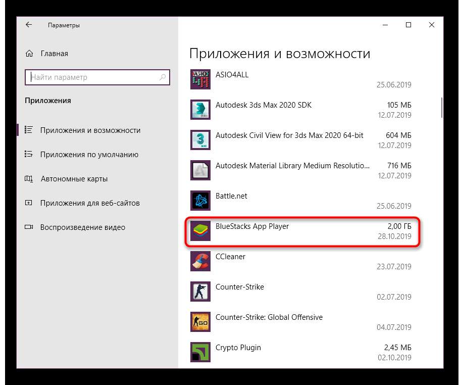 7. По завершении деинсталляции снова вернитесь к списку ПО, чтобы удалить Bluestacks Player — дополнение эмулятора (выполните пункты №5 и №6).