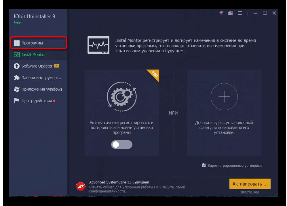 - Скачайте IObit Uninstaller, перейдя по обозначенной выше ссылке, а потом установите и запустите его. В основном меню переместитесь в раздел «Программы».