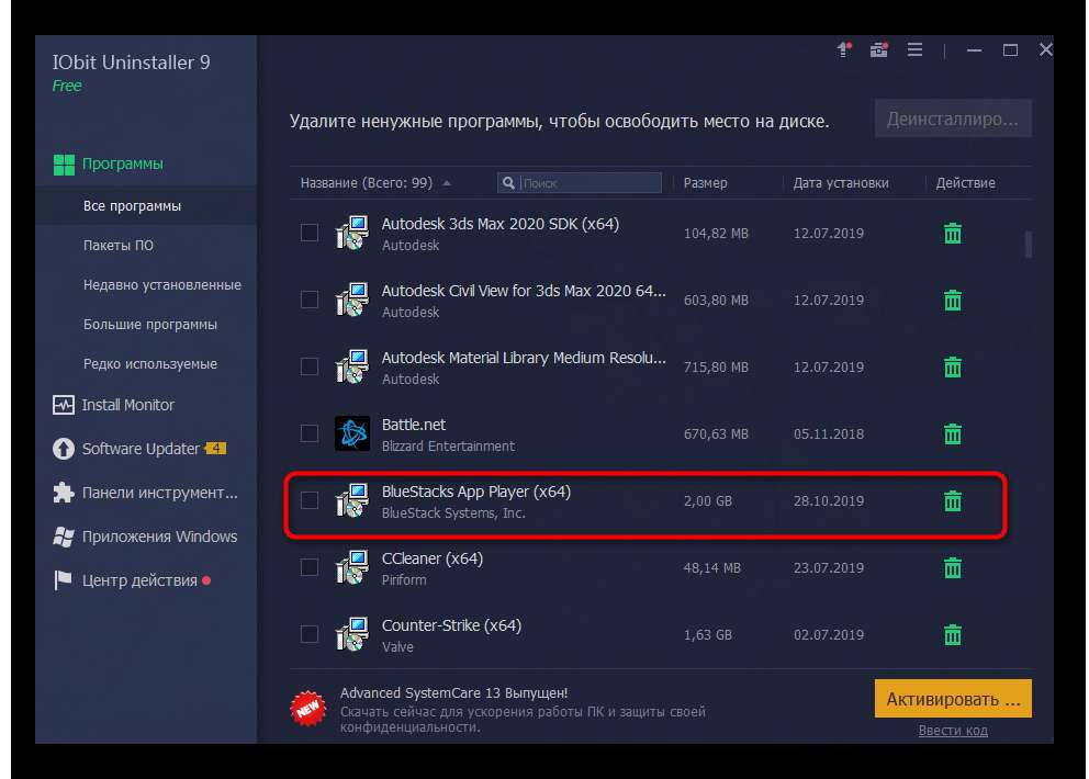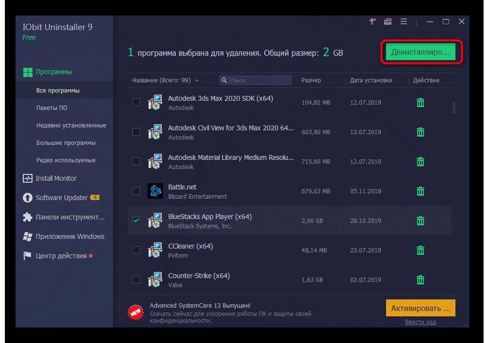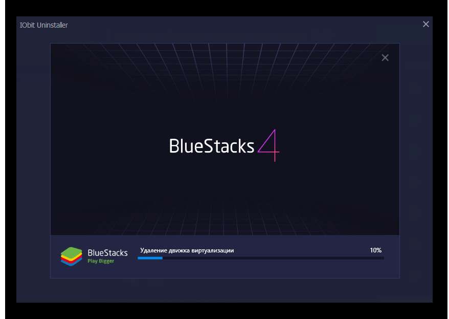 Этот метод позволяет выполнить более качественную очистку системы от Bluestacks. Плюс к этому, на деинсталляцию требуется меньше времени.