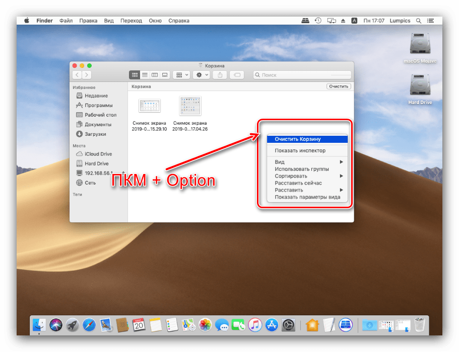 Также из-за защищённых файлов может не работать процедура удаления их из корзины. Процедуру можно выполнить с зажатой клавишей Option: зажмите её, затем используйте пункт контекстного меню «Очистить корзину».