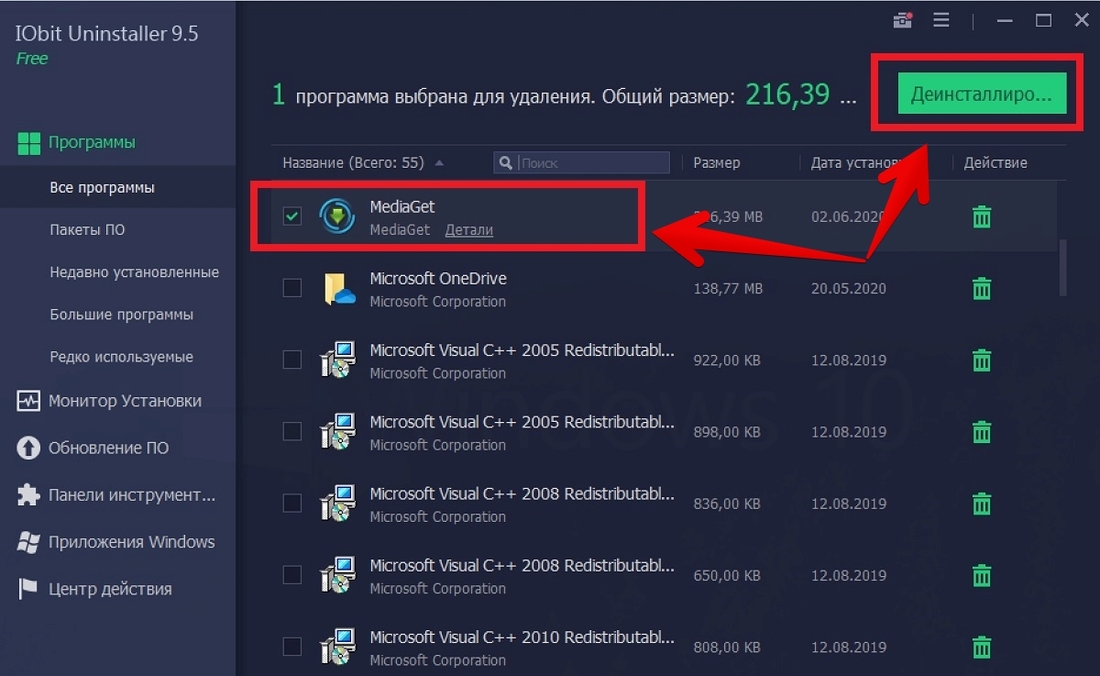 В верхней части окна отображается количество претендентов на удаление и общий объем, который они занимают на дисках. Как и в случае со штатными средствами, необходимо выбрать в списке программу Mediaget (отметьте элемент списка зеленой галочкой) и нажать на зеленую кнопку Деинсталлировать: