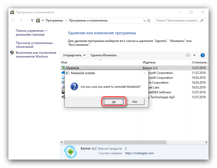 - Нажмите «Да» для начала удаления Медиагета с компьютера.