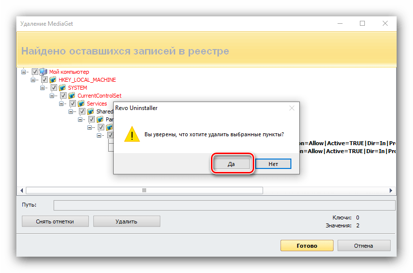 Жмем «Удалить», дабы избавиться ото всех записей реестра, которые там появились в процессе работы MediaGet.