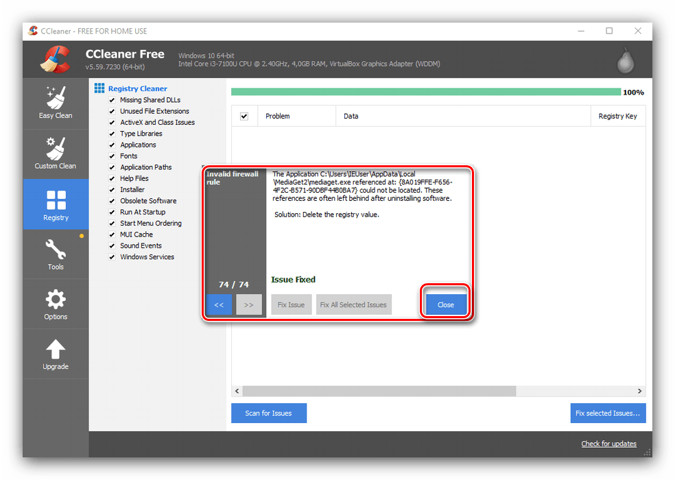 - Дождитесь, пока приложение просканирует данные в реестре, после чего используйте кнопку «Fix Selected Issues».