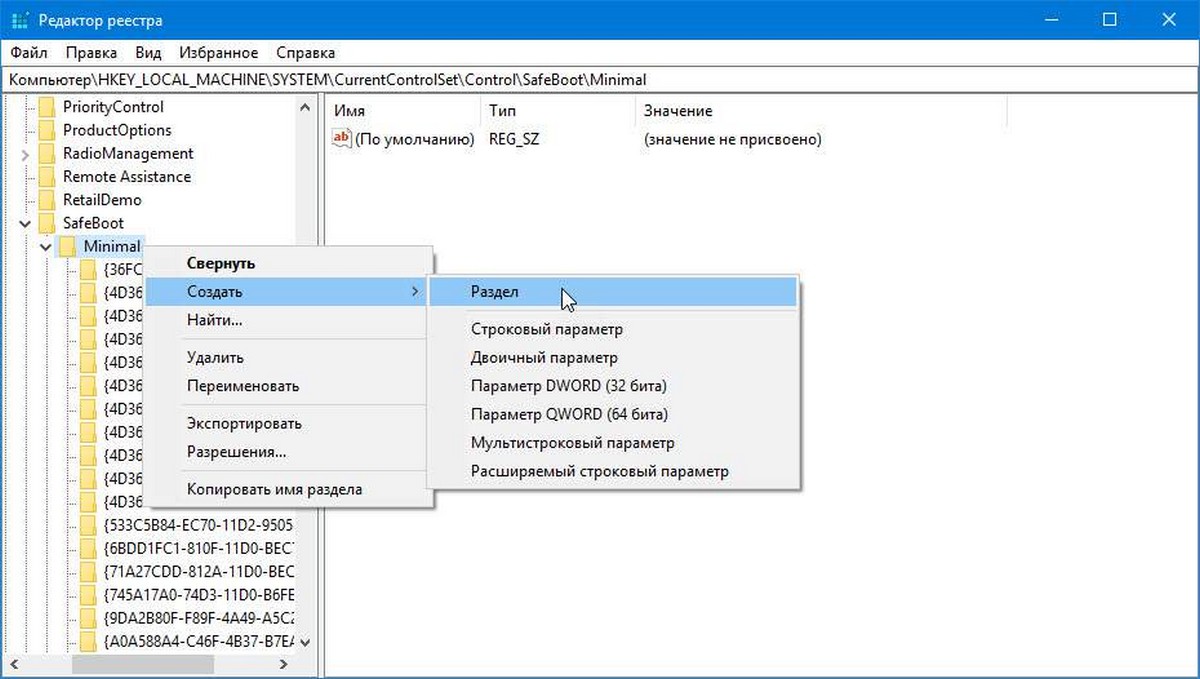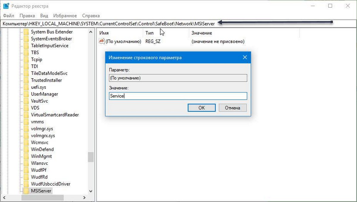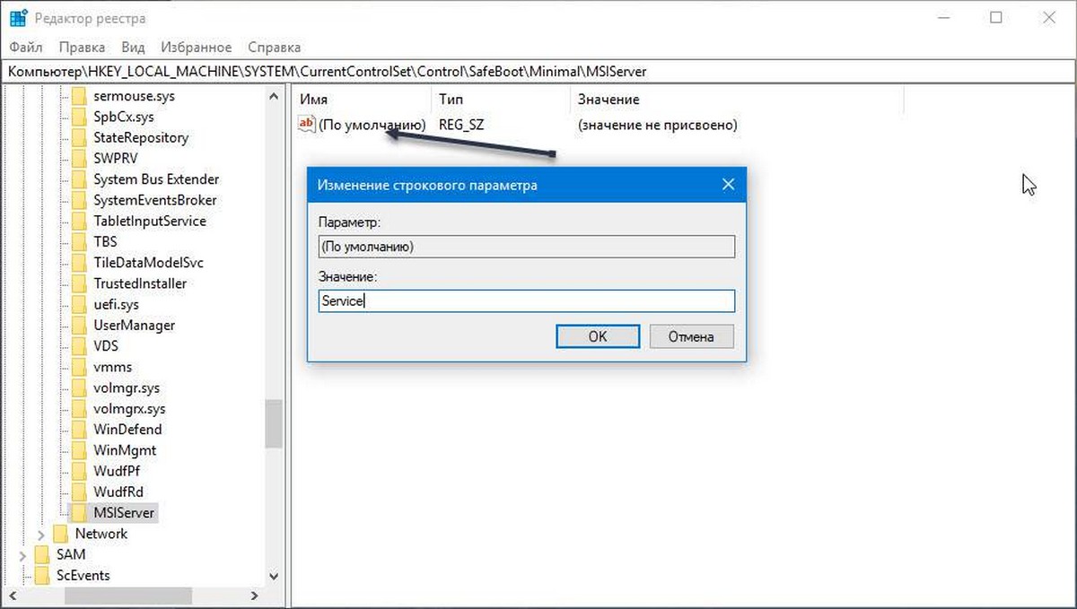 В результате правки системного реестра в разделе HKLMSYSTEMCurrentControlSetControlSafeBootMinimal у нас должен появиться подраздел MSIServer у которого значение параметра По умолчанию должно быть равно Service.