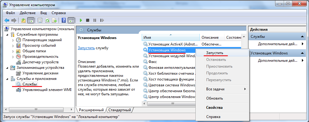 После этого откроется окно «Управление компьютером». В левой области окна в меню переходим в раздел «Службы и приложения» -> «Службы». В правой области окна откроется список служб. В этом списке ищем службу «Установщик Windows», щелкаем по ней правой клавишей и нажимаем «Запустить».