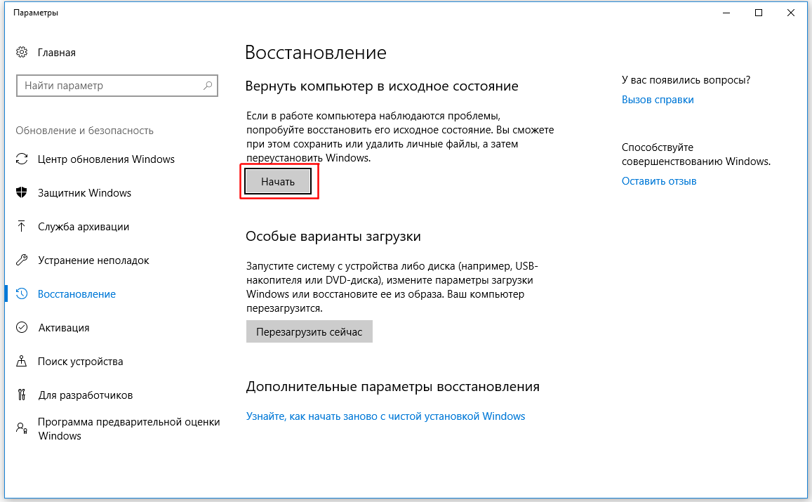 Шаг 2. Перейдите в раздел «Восстановление» слева и нажмите кнопку «Перезагрузить сейчас» в разделе «Расширенный запуск» справа.