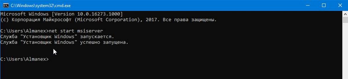 После выше перечисленных действий появится возможность запустить службу Windows Installer. Запустить службу можно несколькими способами. Самый простой это в командной строке набрать net start msiserver. В случае успешного запуска в командной строке появиться сообщение что «служба Установщик Windows успешно запущена».