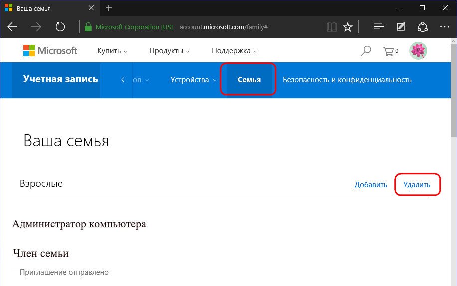 Для удаления зайдите в учетную запись Microsoft администратора компьютера в интернете. На сайте компании в разделе «Семья» нажмите «Удалить».