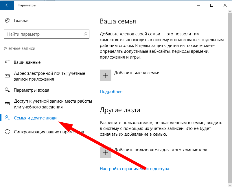 В появившемся окне выбрать раздел с семьей и другими пользователями.