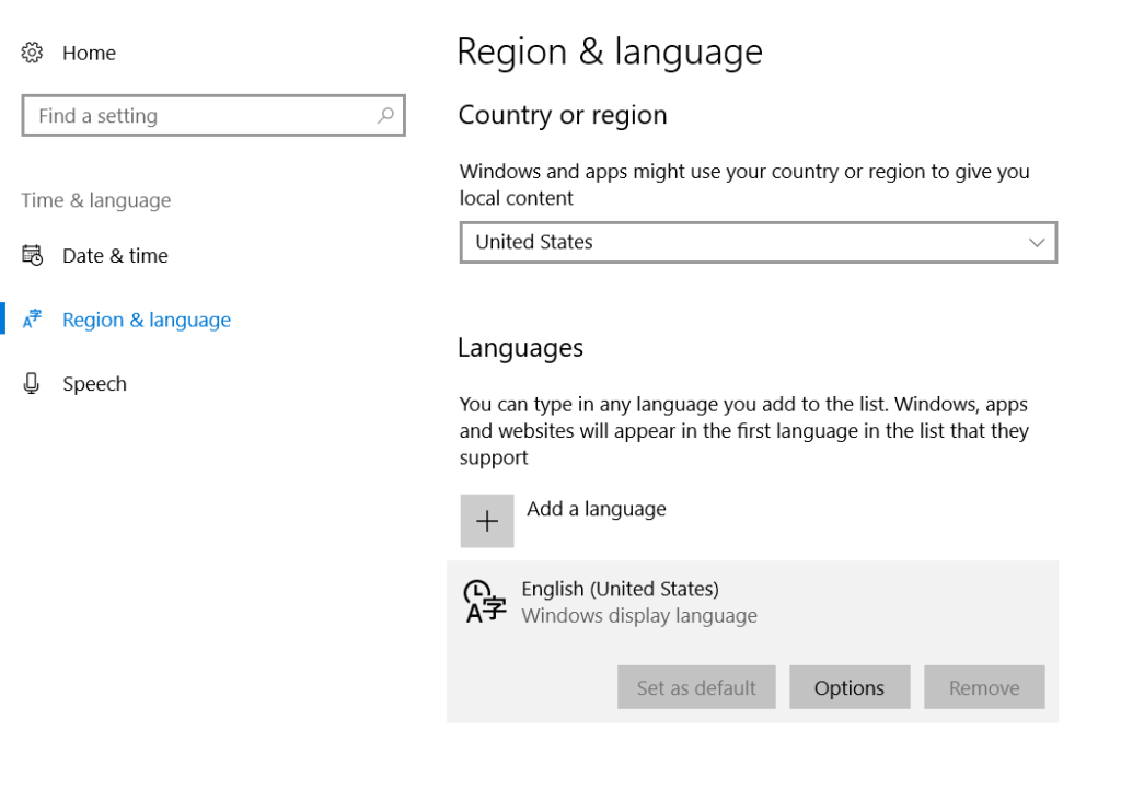 Добавление языка осуществляется в разделе «Параметры», подразделе «Время и язык» и пункте «Регион и язык». Выбрав язык, выберите пункт «Использовать как основной язык» и нажмите на соответствующую страну-носителя языка и ее часовой пояс.