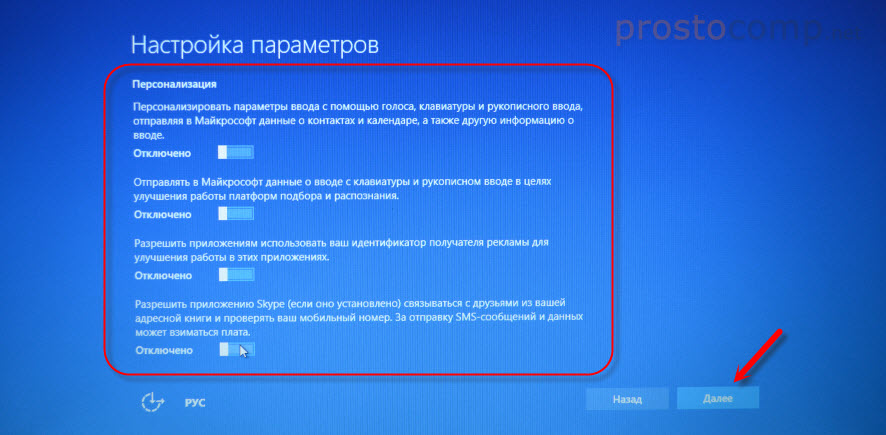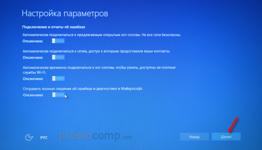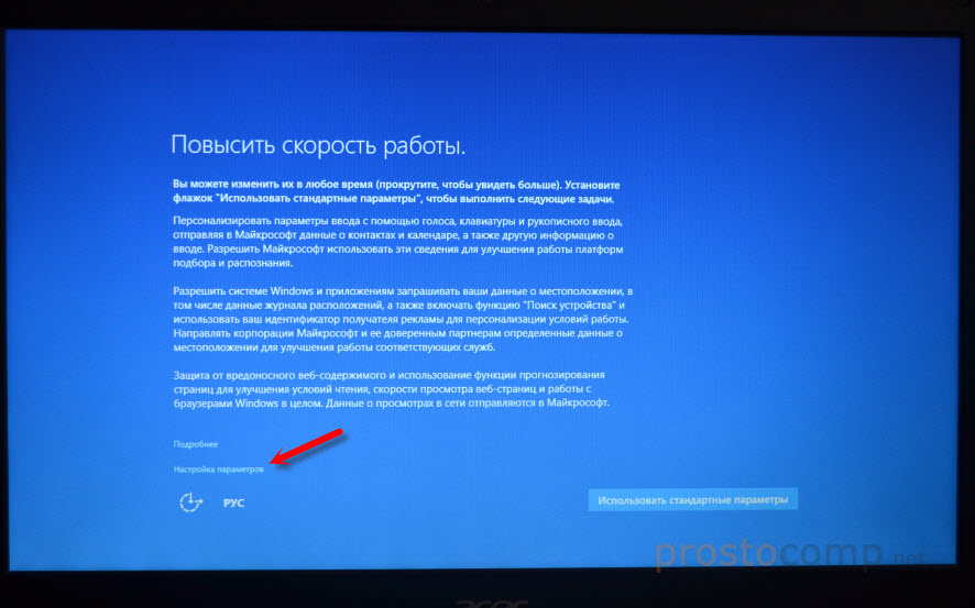 Первое окно – настройка параметров. Не советую выбирать «Использовать стандартные параметры». Нажмите на «Настройка параметров». Там можно отключить много ненужно. Так званную слежку Windows 10, которой все так боятся