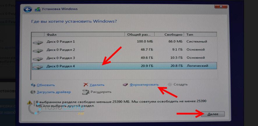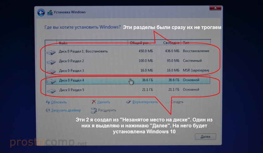 Для продолжения установки выделите раздел который вы хотите отдать под систему (он будет диском C) и нажмите «Далее».
