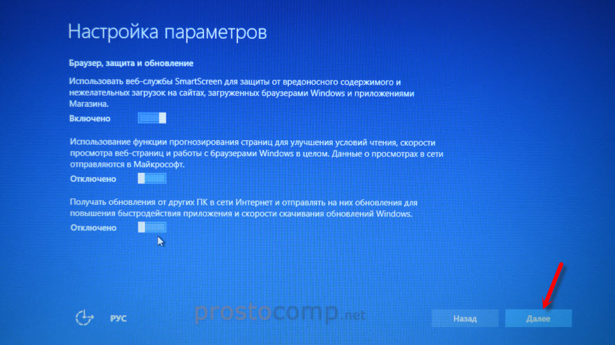 На последней странице оставил включенной только веб-службу SmartScreen.