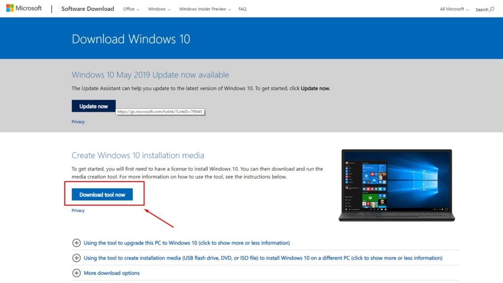 Если у вас нет заранее приготовленного дистрибутива «десятки», проще и удобнее поручить его скачивание утилите Microsoft Media Creation Tools и с ее же помощью записать на флешку или DVD.