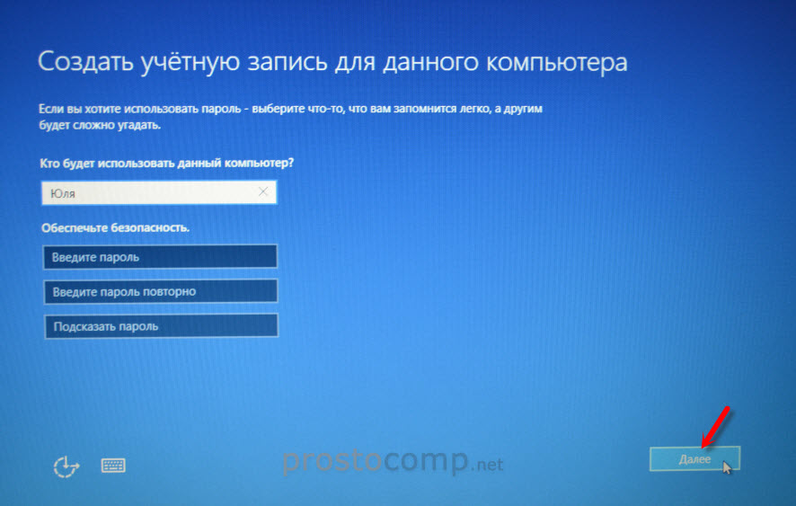 Немного ждем, затем задаем имя компьютера и пароль, если необходимо (я не устанавливал). Нажимаем «Далее».