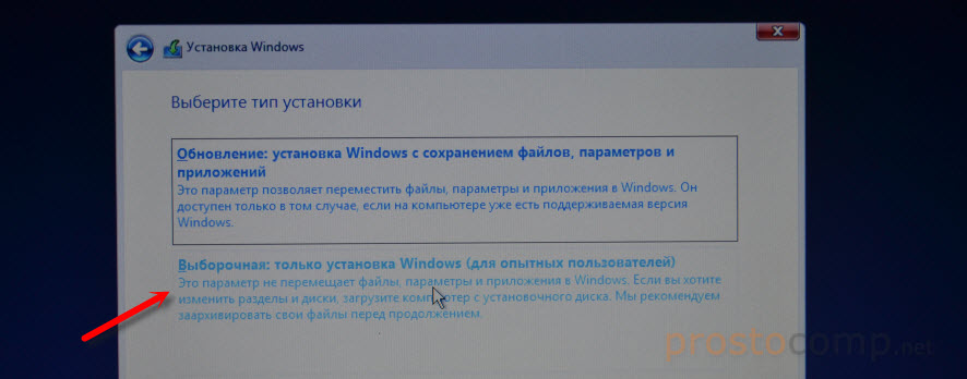 Выбираем тип установки: «Выборочная: только установка Windows».