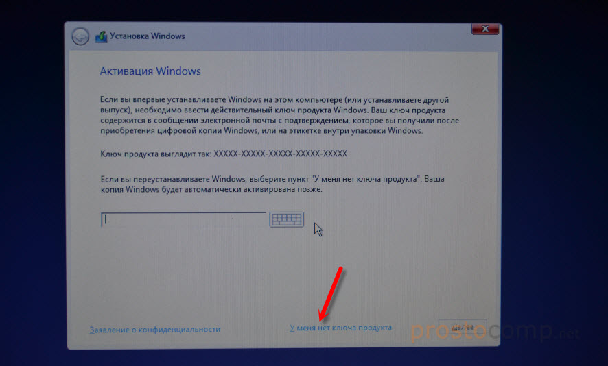 В следующем окне нужно ввести ключ продукта Windows. Если у вас нет ключа, и вы хотите активировать Windows 10 после установки, то нажмите на «У меня нет ключа продукта».