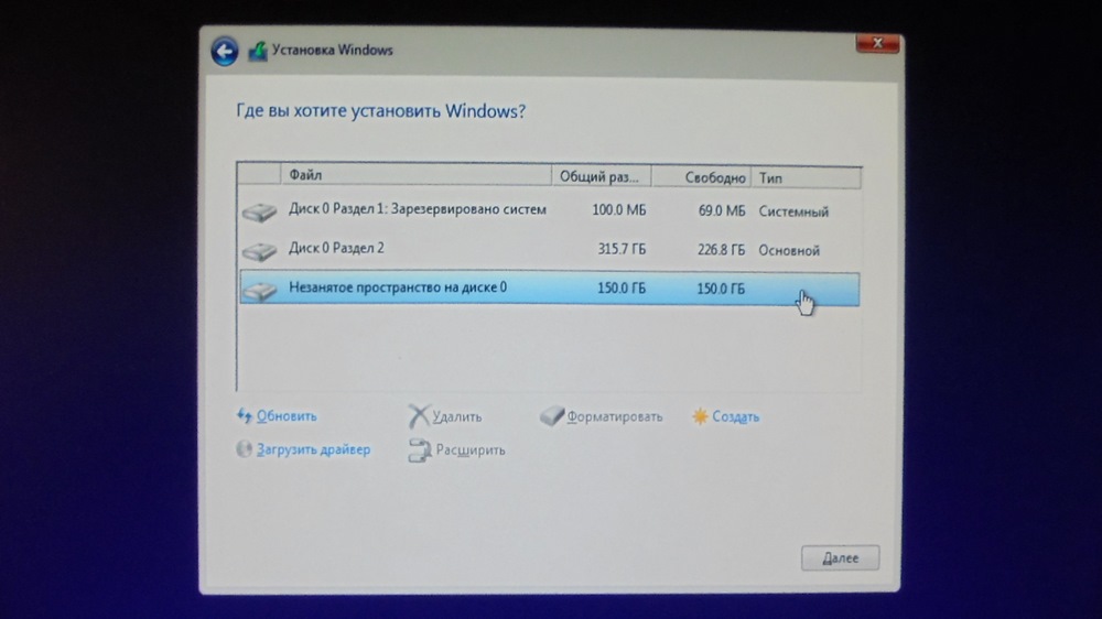 3. система предложит выбрать диск, на который будет произведена установка;4. здесь необходимо нажать на созданный нами раздел, он будет обозначен как «незанятое дисковое пространство» (диск с ОС будет значится в качестве основного);