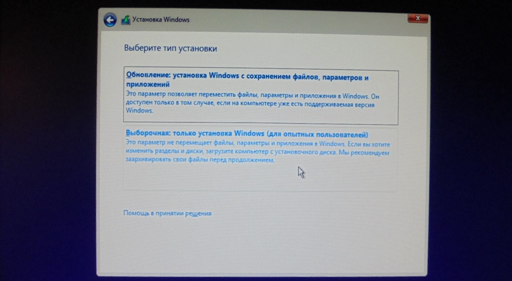 2. на экране «тип установки» необходимо выбрать «выборочная»;