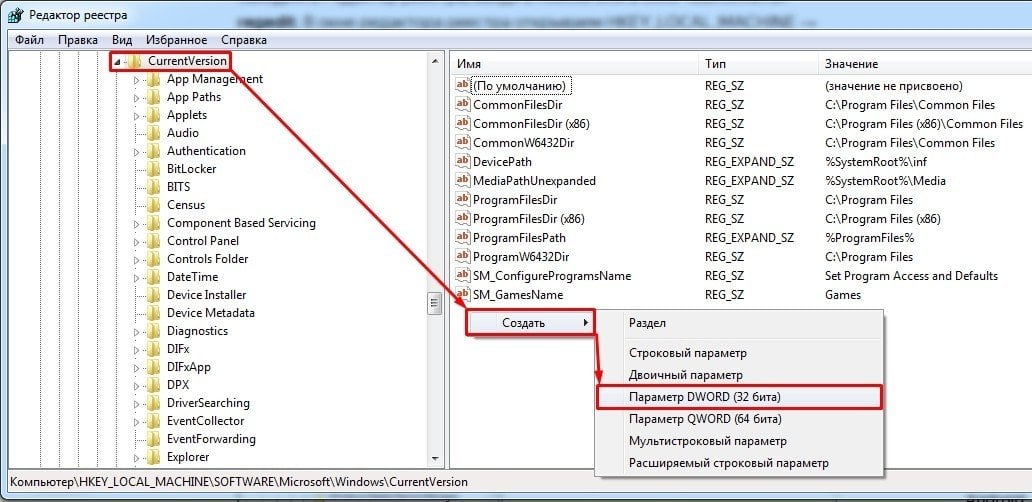 Далее необходимо открыть несколько папок, располагающихся с левой стороны: HKEY_LOCAL_MACHINE/SOFTWARE/Microsoft/Windows/CurrentVersion. Проделав «папочное путешествие», создайте параметр DWORD.