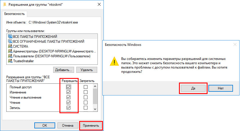 Внизу, в столбце «Разрешить» выставляем галочки для всех доступных параметров, как указано на скриншоте. Жмем «Применить». И подтверждаем решение в окошке, которое появится далее.