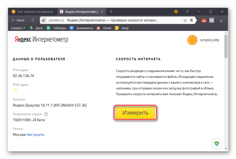 Сервис проверки скорости соединения от одноименной поисковой системы. Чтобы произвести измерения нужно нажать желтую кнопку «Измерить».