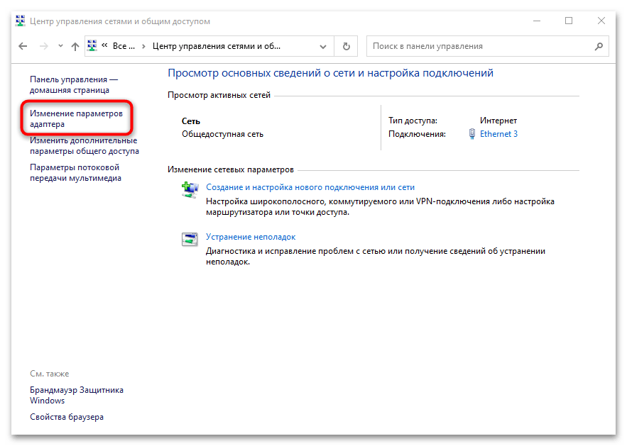 На панели слева выберите строку «Изменение параметров адаптера».